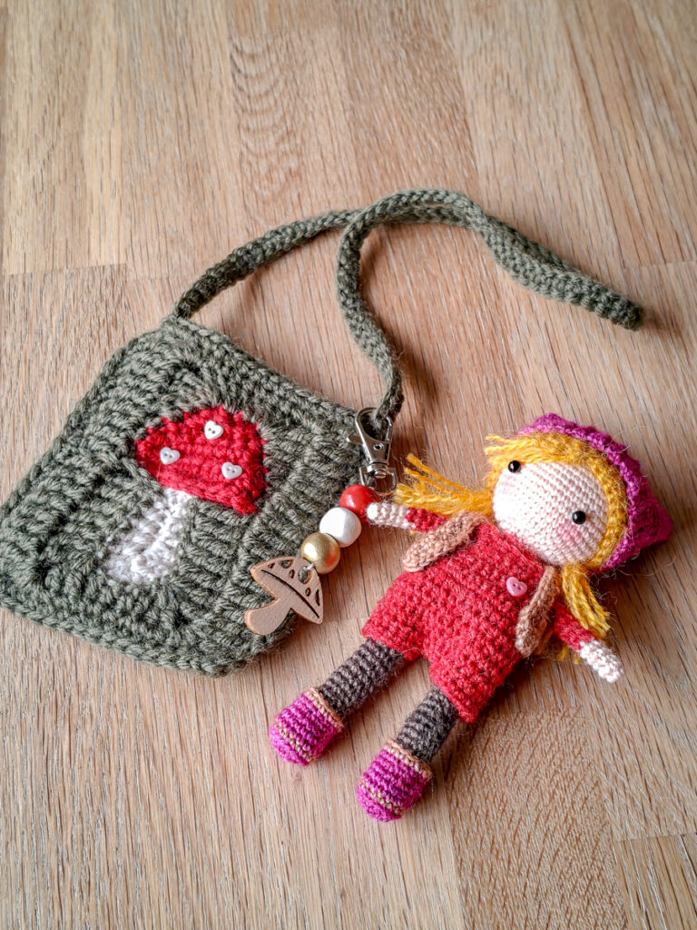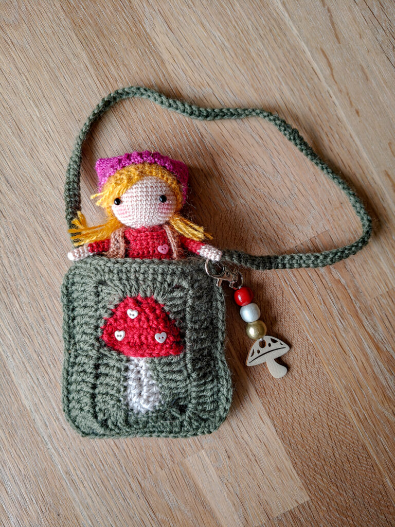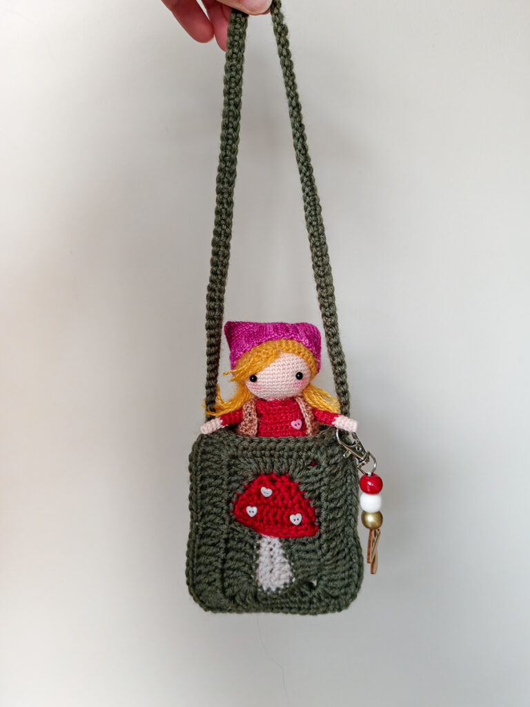 In plaats van de granny square in een deken of kussenhoes te gebruiken, maakte ik er een mini-tasje van door de randen dicht te haken. Ook heb ik paddenstoelen-stippen toegevoegd door middel van kleine hartvormige knoopjes. Om het tasje nog net een beetje extra charme te geven, voegde ik een hanger van houten kralen toe. Het tasje is nu de perfecte woonplek voor mijn kleine herfstvriendin — een combinatie van twee losse patronen die samen heb gevoegd!