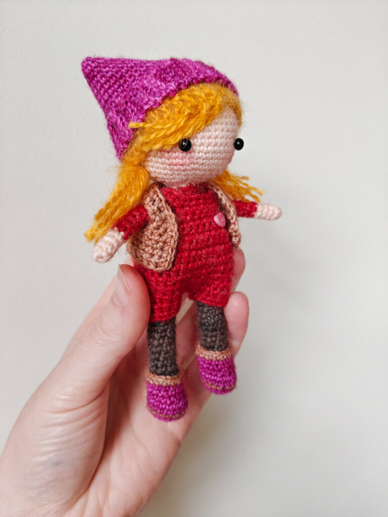 Het herfstmeisje is gehaakt met restjes sokkenwol, waardoor de heel klein is en goed in het tasje past! Ik gebruikte hiervoor het patroon van Lulu Compotine wat je hier op Etsy kan kopen. Voor het haken met sokkenwol gebruik ik haaknaald 1,75 mm.